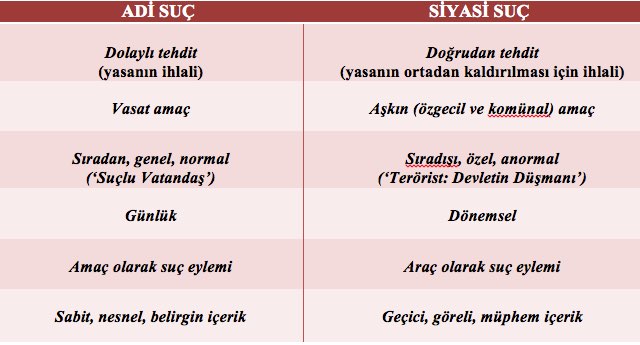 Yasa, sıradan ve genel, yani normal olarak görünen suç şekillerini rahat bir kesinlikle tanımlayıp düzenlerken, siyasi suç, hem onun doğrudan devlet ve hukuk sistemini hedef alan sıradışılığı ve dönemselliği (conjuctural) hem de hegemonyanın kendisinin kayganlığından ötürü, yasa için önceden ayırt edilip tanımlanamaz bir müphemliğe sahip olur. Yasayı siyasal iktidarın rehberliğine muhtaç bırakan söz konusu bulanıklığa rağmen hem yasa hem de eyleyici açısından yasadışı bir eylemin siyasallığı, onun aşkın (özgecil ve komünal) bir amaca hizmet etmesi, yani araçsallığı ile inkâr edilemez, apaçık bir hale gelir. Dolayısıyla “siyasi suç”, biçimsel olarak, eylemin amacı üzerinden kolaylıkla tespit edilir; ancak içerik olarak, yasada ucu açık bir şekilde tanımlanır. Kitaptan aktarılan aşağıdaki tabloda siyasi ve adi suç arasındaki farklar karşılaştırmalı olarak verilmiştir: