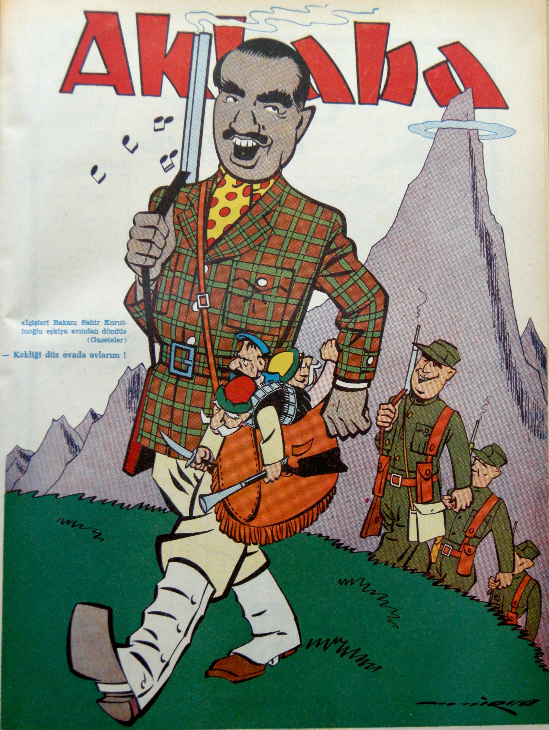 Akbaba dergisi, başarılı bir avdan sonra neşeli bir şekilde şarkı söyleyen bir avcı olarak resmettiği İçişleri Bakanı’nı, bizzat yönettiği eşkıya avları üzerinden alaya alıyordu.