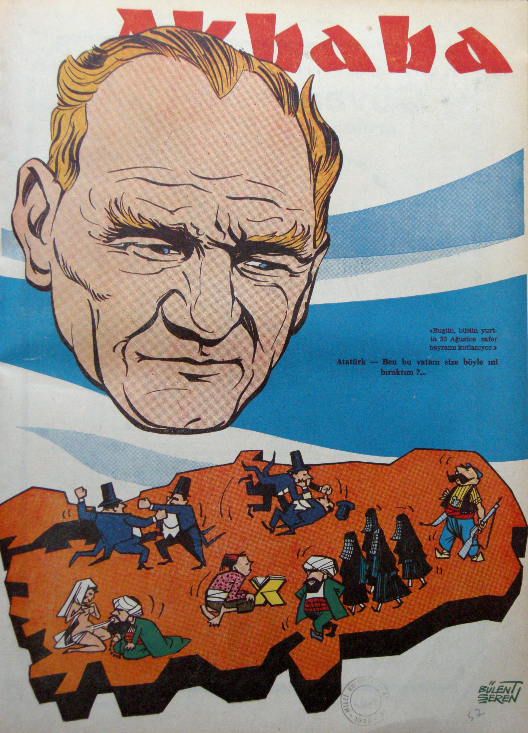 Her türden tehdidin temizlendiği bir dönem olarak “Atatürk’ün altın yılları” popüler temasına, ulusal yazılı basında, sıklıkla mevcut Hükümetin eleştirisi için başvuruluyordu. Akbaba dergisinin aşağıdaki kapağı, ülkeyi çevreleyen belaları (i) “dinci gericilik”, (ii) siyasetçilerin yozlaşması ve (iii) bir eşkıya imgesiyle temsil edilen Doğu bölgelerinde kamu düzeninin bozulması olarak özetliyordu.