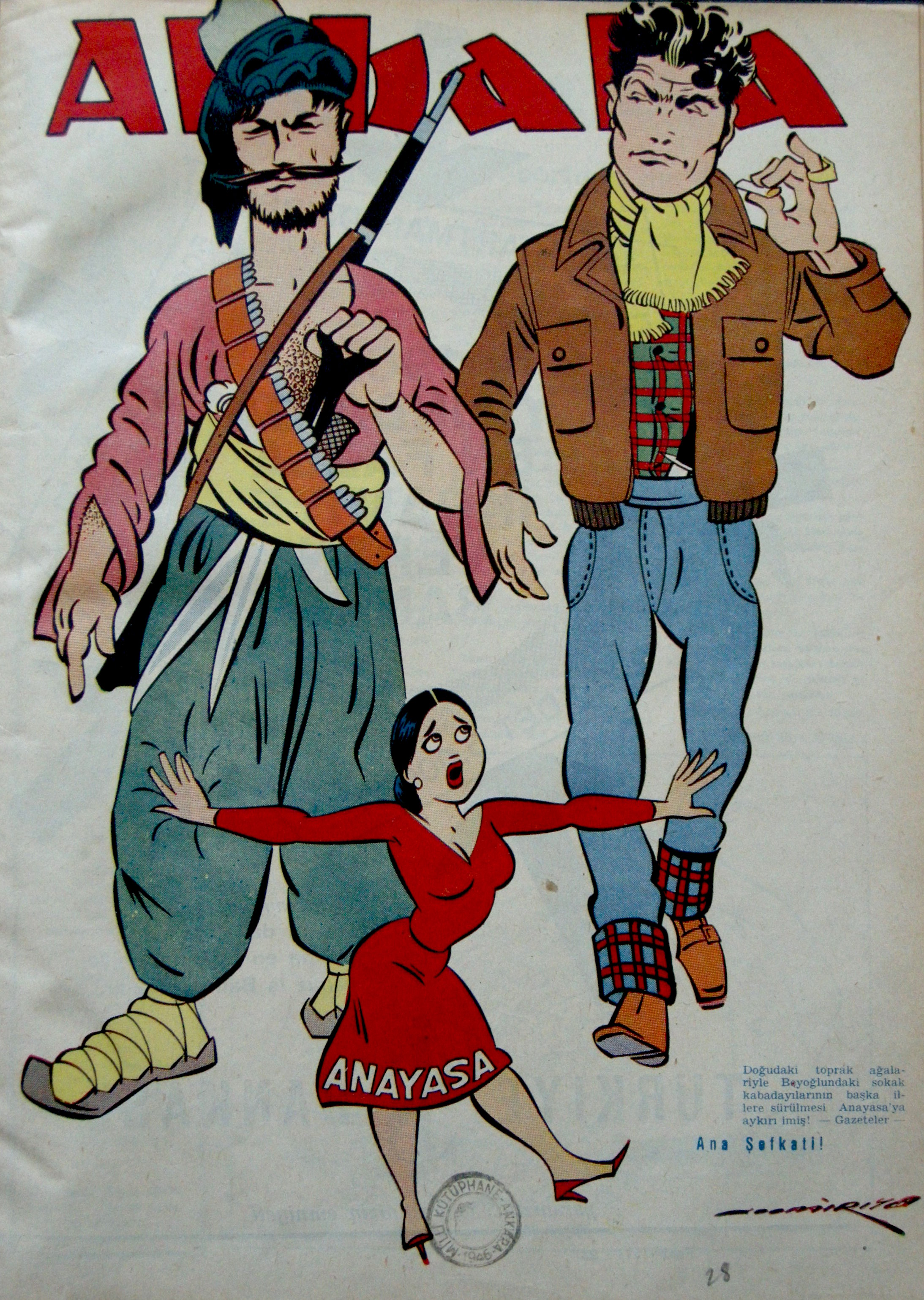 “Gazeteler: ‘Doğudaki toprak ağalarıyla Beyoğlu’ndaki sokak kabadayılarının başka illere sürülmesi Anayasa’ya aykırıymış. Anayasa – Ana Şefkati!”
