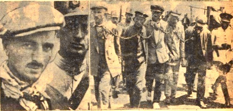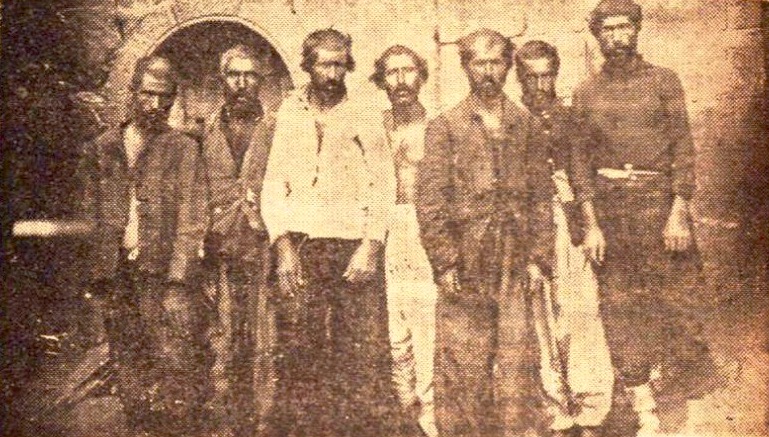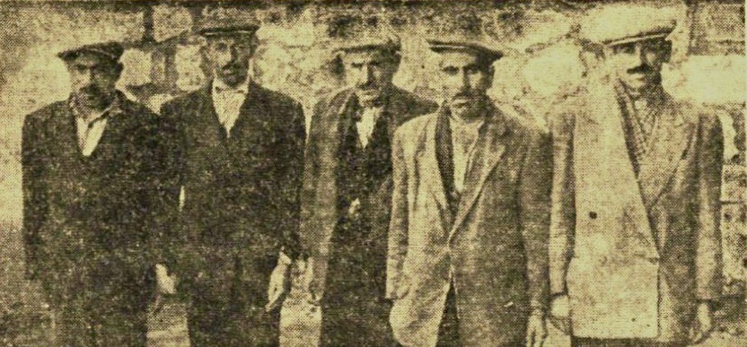 Bursa’da şekavet ve cinayetle suçlanan eşkıyalar, boyunlarından birbirlerine kelepçeli hâlde görülüyor. En soldaki kişi, çetenin başı olduğu iddia edilen Laz Mustafa‘dır.